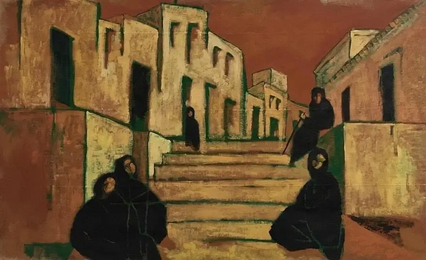 Staring at us from the past, the women of Nazaré speak silently of their rugged lives. A bit more simplistic or geometrical rendering, but a powerful composition with much subtle textures if you zoom in. Cubism & Expressionism merge to respond and honour the photography by Artur Pastor of the same theme.
