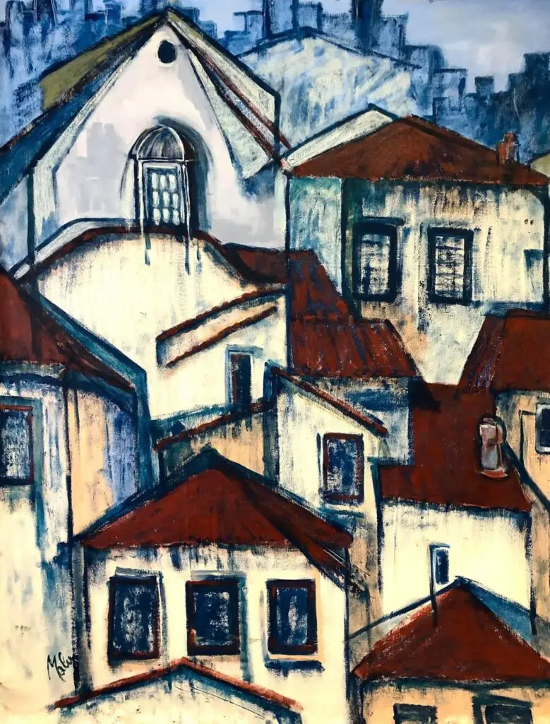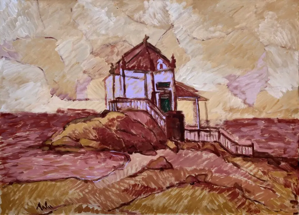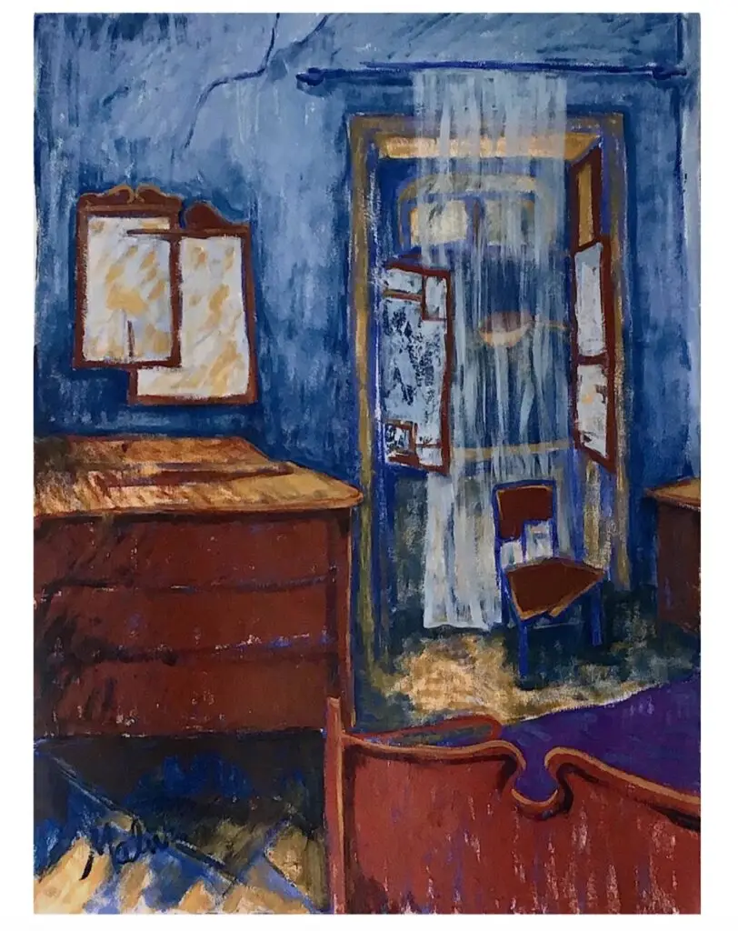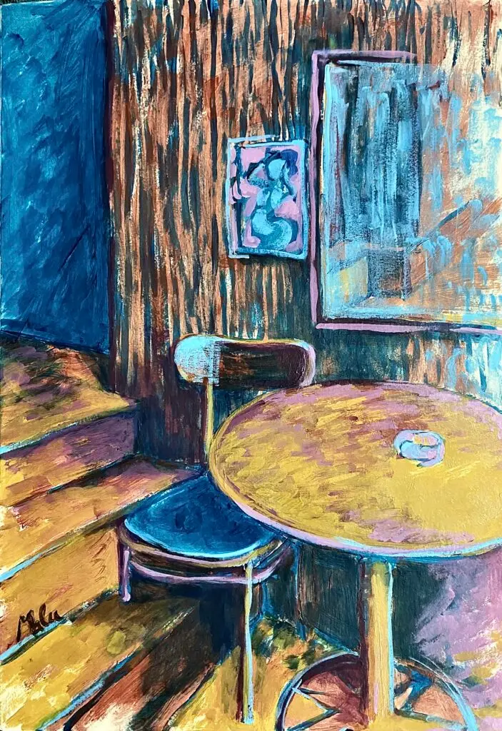 Cubism is a language which unconsciously, we all express in our creative moments or in design choices; not dissimilar to the invention of perspective as visual tool, Cubism – perhaps a contradiction or challenge to perspective as a tool- is part of our unconscious. Malu has a unique response and synthesis of visual elements to the various types of Cubism. She mixes elements of Proto-Cubism (e.g. Cezanne) with Synthetic Cubism (e.g. Matisse), at times results seem more formal as in Analytical Cubism (e.g. Braque & Picasso 1010-12), but it is not. In reality her style is far more playful, less contrite, and more spontaneous, intuitive as later works by the latter artists. She mixes this research with elements of Expressionism and Outsider Art (in the characters especially, as Malu is semi-autodidactic). She began to call her painting portfolio Gates of Perception around 2011, but for the last 8 years, living partly in Europe again, she realised she was creating a form of personal or unique  Visual Magical Realism echoing narratives by writers G.G. Marquez and I. Allende. She was turning her images naturally into visual statements about the subjectivity of perception, using plasticity to convey both the ephemeral quality of nature, while at times, bringing time to an almost frozen state of being, as if time exists inside time. – A visual existentialist portfolio highlights these concepts below.