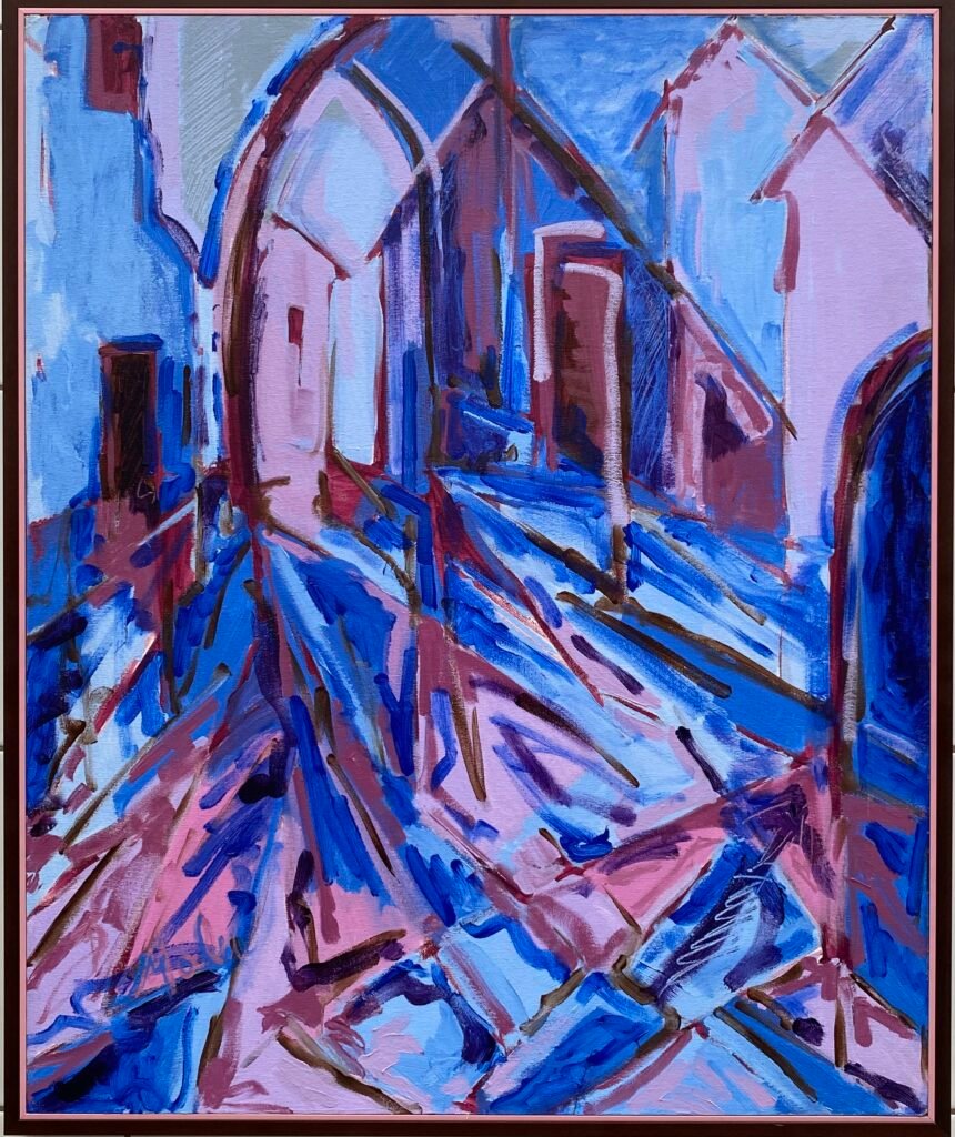 This piece also directly addresses the passage of time theme with the  syncretism style of Cubism & Expressionism, but also quite literally in the image itself. A vibrant composition in almost monochromatic blues. Our gaze and emotions are guided by light.- Before Malu had her two daughters, she had a day dream of walking in an old town, into the light of the sun, holding her daughter’s hand and carrying the other – this is perceived subtlety in the bright focus of the painting.