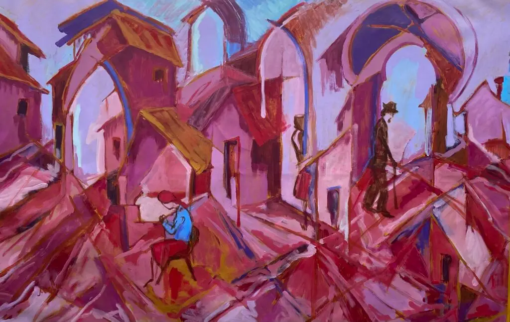 Uses syncretism of Cubism, Expressionism and Outsider Art to create a universal but quaint scene in almost monochromatic harmony. Dominant narrative elements reoccurring, each figure living in their own personal universe – unfinished for now.